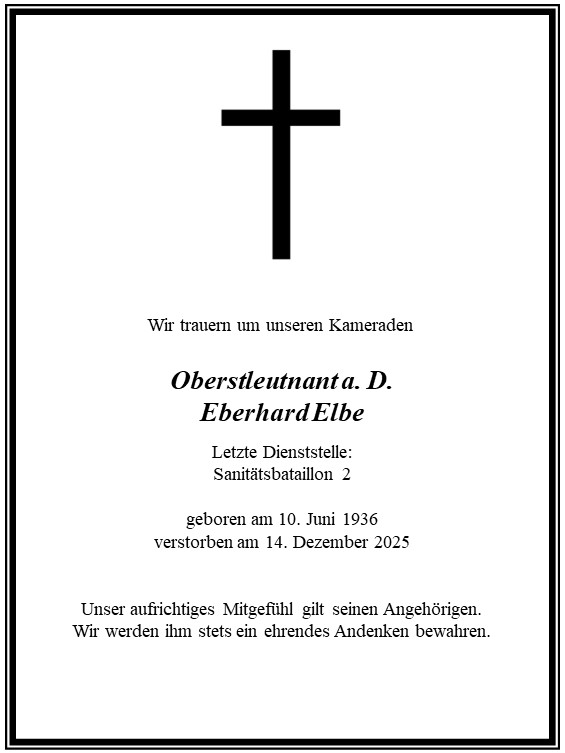 Oberstleutnant a. D. Eberhard Elbe verstorben. Die Trauerfeier mit anschließender Urnenbeisetzung erfolgte am 2. Januar 2026 in Marburg.