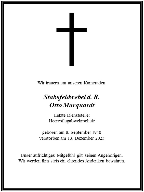 Stabsfeldwebel d. R. Otto Marquardt am 13. Dezember 2025 verstorben. Die Beisetzung wird zu einem späteren Zeitpunkt im engsten Familienkreis stattfinden.